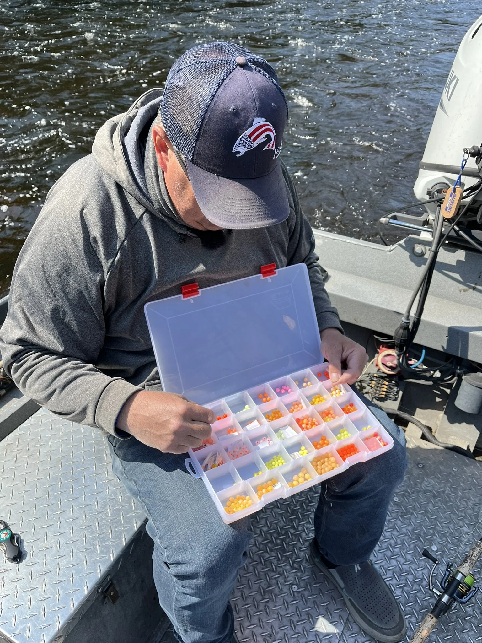 In the drift, the presentation must move at the pace of the current. Whether you are bottom bouncing or float fishing, using the proper weight and equipment so that the bead is not cruising too fast or slowly dragging near the bottom is very important. A bead that is large or having an inadequate amount of weight may drift ahead too fast, enabling a chance of a missed hook up.