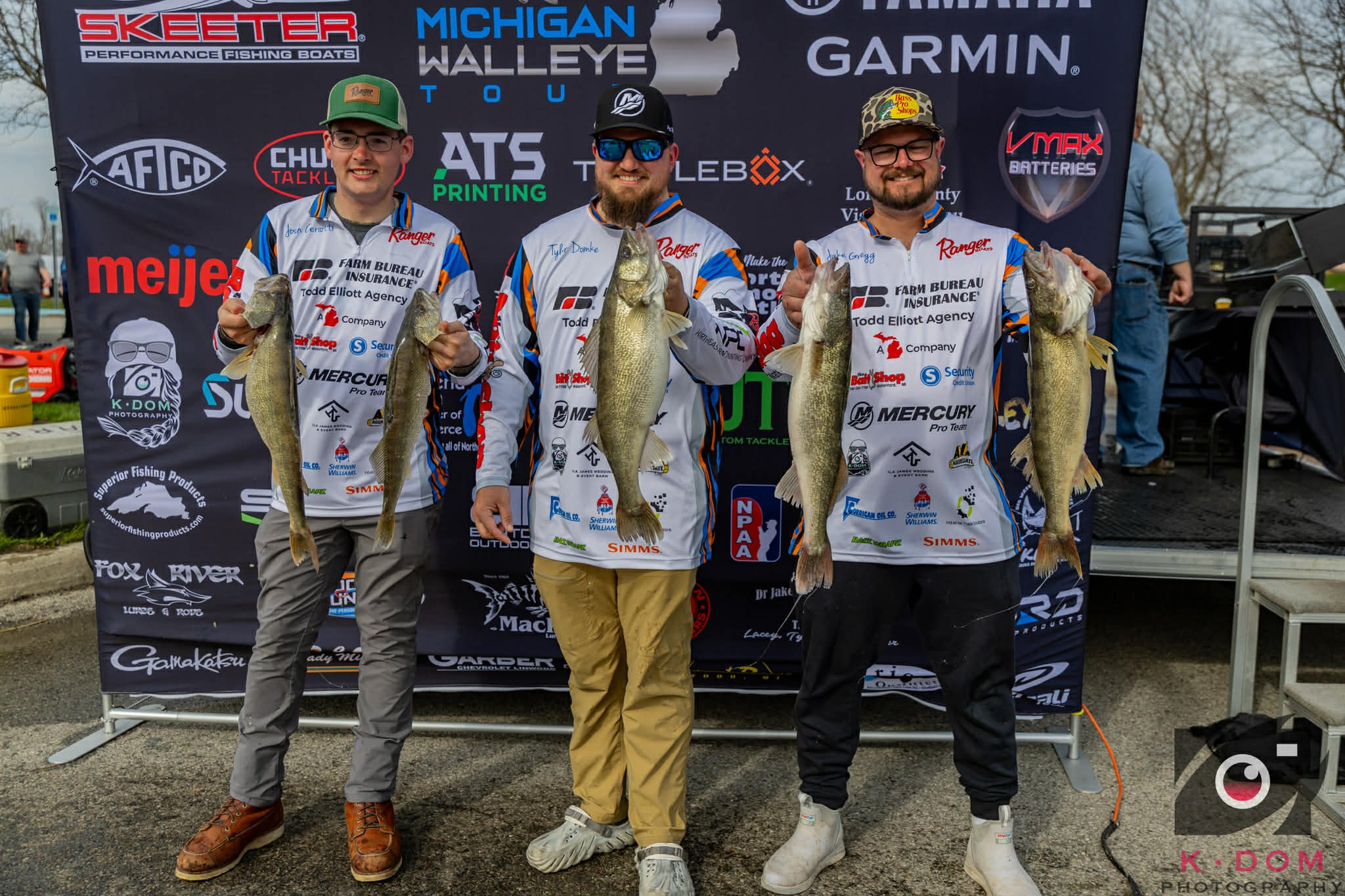 Tyler Domke (middle) shows off some fish with his MWT teammates, Josh Ceroitti (left) and Jake Greg (right), from the 2026 Detroit River Tournament.